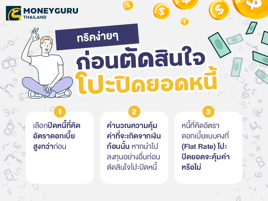 สำหรับการโปะปิดยอดหนี้ หากคุณมีเงินก้อนที่สามารถโปะหนี้ได้ทั้งหมดเพื่อจะได้ไม่ต้องมีภาระจ่ายดอกเบี้ยอีกก็ควรทำค่ะ โดยอาจใช้หลักเกณฑ์ง่ายๆ ในการพิจารณา ดังนี้