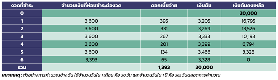 ดังนั้นยอดที่นายหมุนเงินต้องจ่าย คือ (20,000 + 2,400)/6 = 3,733 บาทต่อเดือน