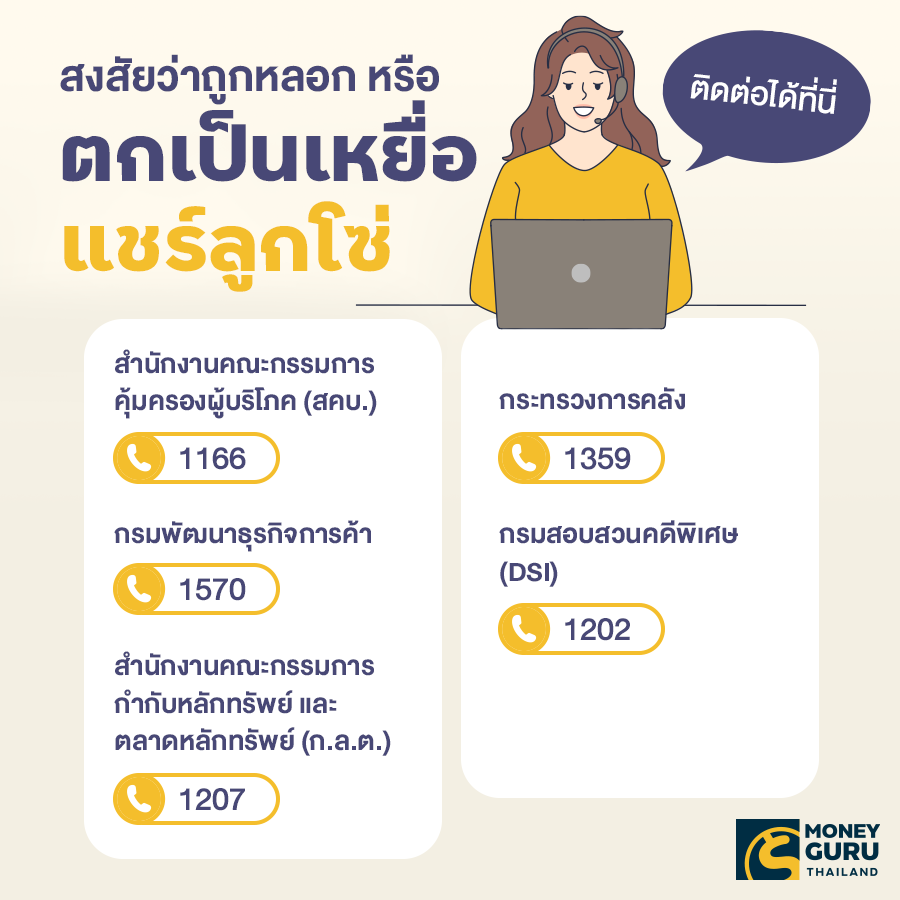 - แจ้งความร้องทุกข์ได้ที่ กรมสอบสวนคดีพิเศษ (DSI โทร. 1202)