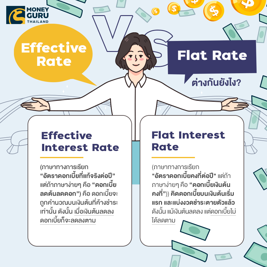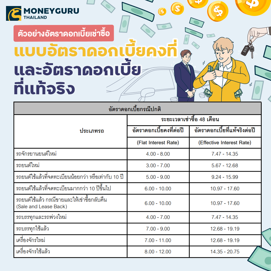 | เพดานดอกเบี้ยสูงสุดที่คิดได้ | คิดแบบ Flat Rate และไม่มีกำหนดเพดานอัตราดอกเบี้ยสูงสุดเอาไว้ แต่ในทางปฏิบัติ ปัจจุบันคิดกันประมาณนี้ • รถยนต์ใหม่ 2.5-7% ต่อปี • รถยนต์ใช้แล้ว 4-10% ต่อปี • จักรยานยนต์ 18-25% ต่อปี | ยังคิดแบบ Flat Rate ได้แต่ต้องระบุว่าถ้าแปลงเป็น Effective Rate จะเป็นเท่าไหร่ และถ้าแปลงแล้ว Effective Rate ต้องไม่เกิน • รถยนต์ใหม่ ไม่เกิน 10% ต่อปี • รถยนต์ใช้แล้ว ไม่เกิน 15% ต่อปี และ • รถจักรยานยนต์ ไม่เกิน 23% ต่อปี |