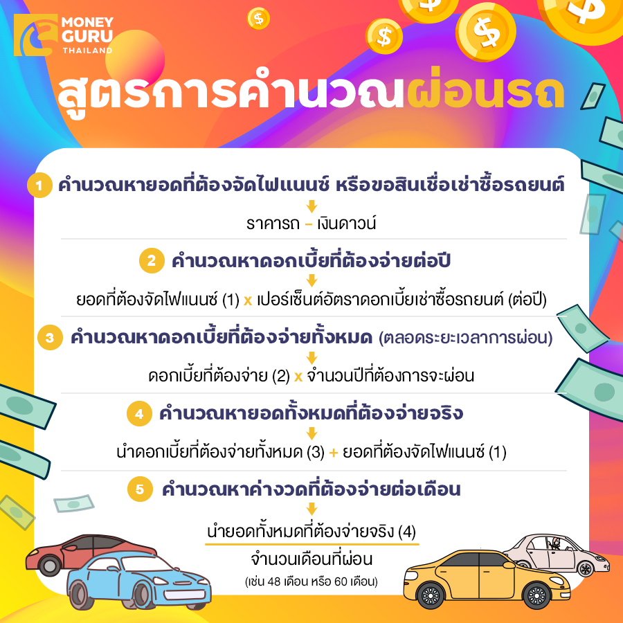 ดังนั้น ยอดผ่อนต่อเดือน เท่ากับ 517,275 ÷ 60 = 8,621.25 บาท (5)