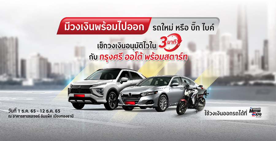 - สินเชื่อรถใหม่ กรุงศรี นิว คาร์ เฉพาะลูกค้าที่สมัครสินเชื่อรถยนต์ใหม่ภายในงาน Motor Expo 2022 ระหว่าง วันที่ 30 พฤศจิกายน – 12 ธันวาคม 2565 ในบูธ กรุงศรี ออโต้ เท่านั้น