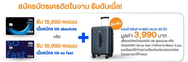 สมัครบัตรเครดิต ทีทีบี ในงานมอเตอร์เอ็กซ์โป รับดับเบิ้ล! เมื่อสมัครบัตรเครดิตใบแรก รับทั้งคะแนนสะสม และรับกระเป๋า ล้อลาก BSC Luxury Blue 20 นิ้ว จำนวน 1 ใบ มูลค่า 3,990 บาท