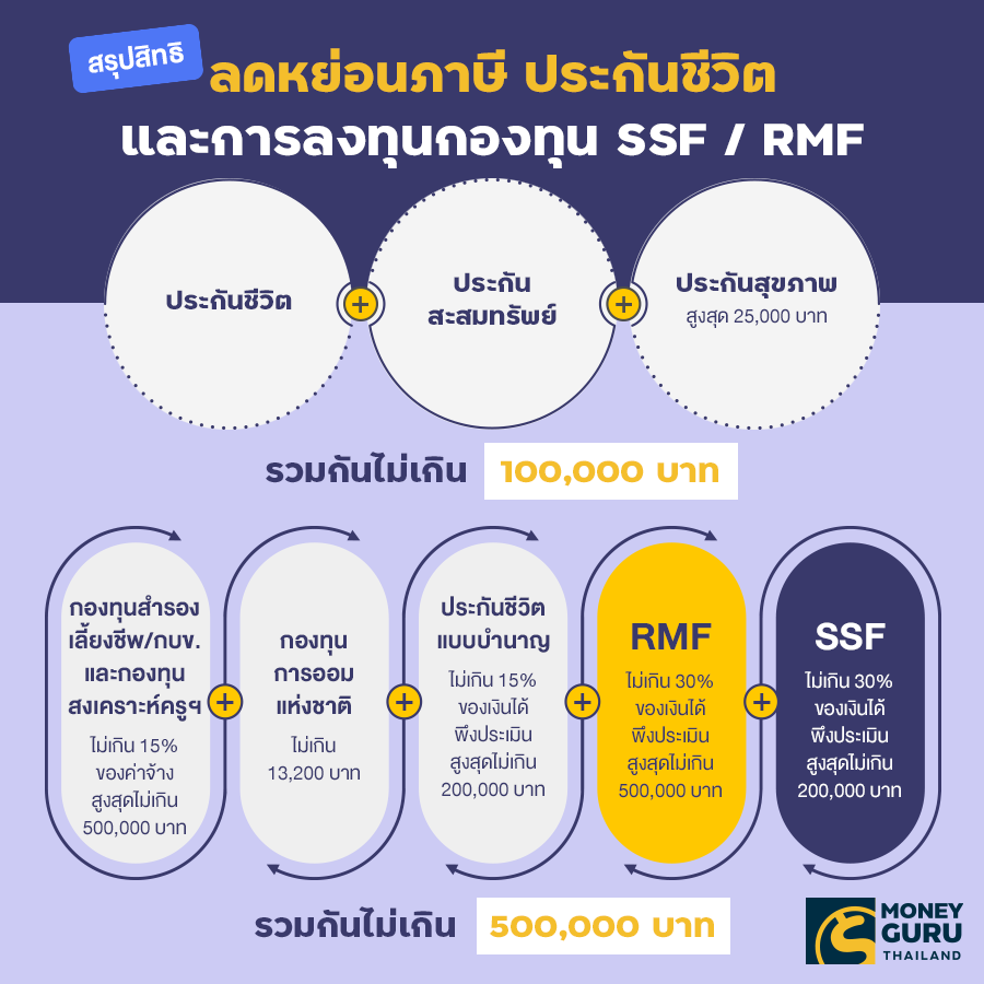 ทั้ง SSF, RMF, กองทุนสำรองเลี้ยงชีพ ประกันบำนาญ กบข. รวมกันทั้งหมดลดหย่อนได้ไม่เกิน 500,000 บาท