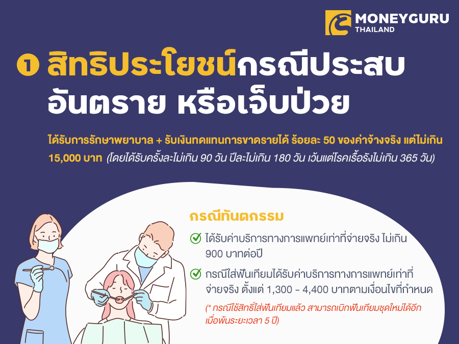 - กรณีทันตกรรม ได้รับค่าบริการทางการแพทย์เท่าที่จ่ายจริงตามความจำเป็น ไม่เกิน 900 บาทต่อปี (กรณีถอนฟัน อุดฟัน ขูดหินปูน และผ่าตัดฟันคุด)