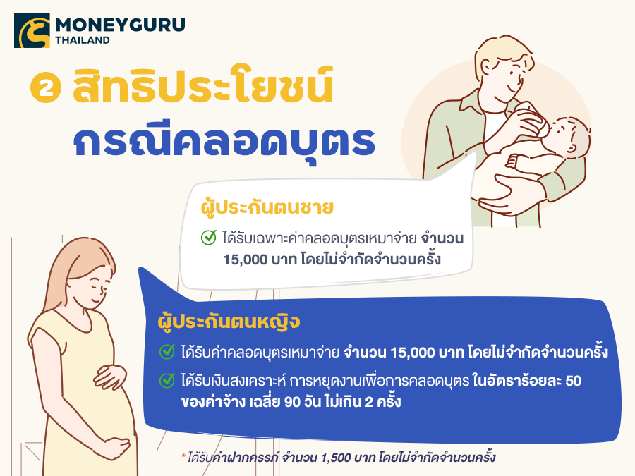 - ได้รับเฉพาะค่าคลอดบุตรเหมาจ่าย จำนวน 15,000 บาท โดยไม่จำกัดจำนวนครั้ง