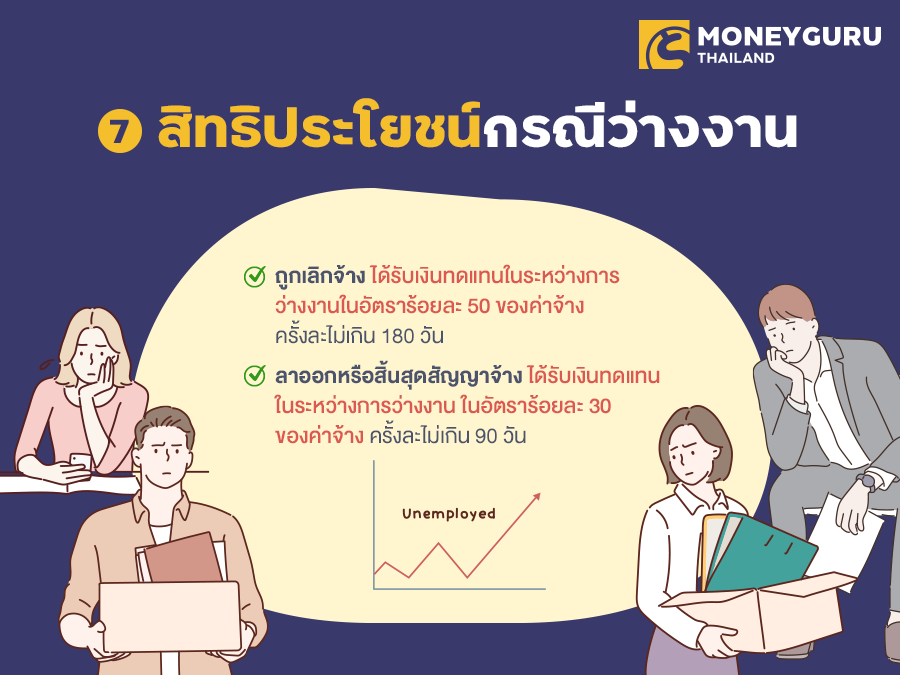 - ถูกเลิกจ้าง ได้รับเงินทดแทนในระหว่างการว่างงานในอัตราร้อยละ 50 ของค่าจ้าง ครั้งละไม่เกิน 180 วัน