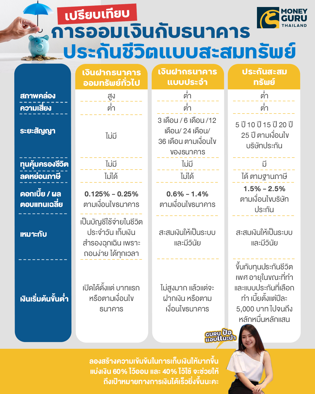 เปรียบเทียบการออมเงินกับธนาคาร หรือประกันชีวิตแบบสะสมทรัพย์