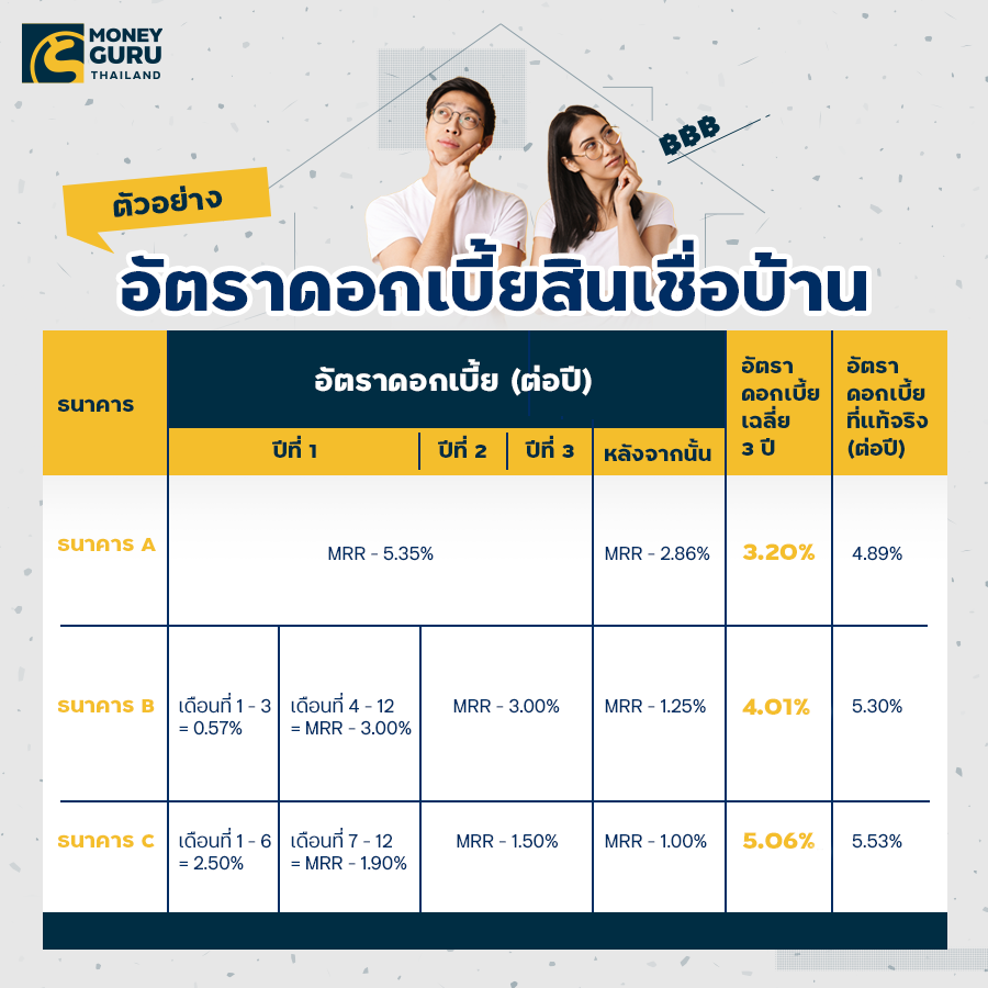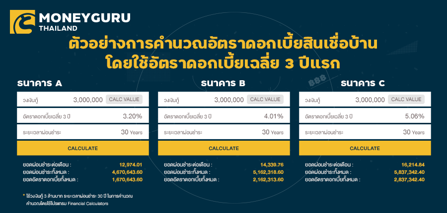 ตัวอย่างการคำนวณอัตราดอกเบี้ยสินเชื่อบ้าน โดยใช้อัตราดอกเบี้ยเฉลี่ย 3 ปีแรก