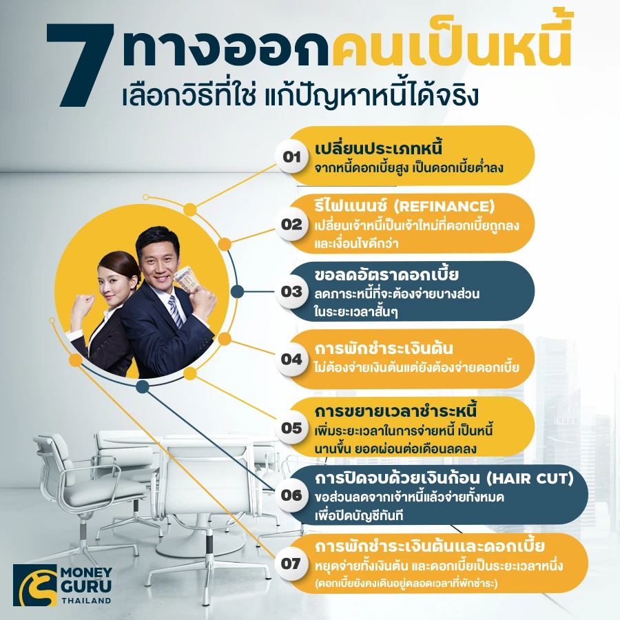 6. การปิดจบด้วยเงินก้อน "แฮร์คัท" (hair cut) เป็นการขอส่วนลดจากเจ้าหนี้แล้วจ่ายทั้งหมดเพื่อปิดบัญชีทันที เหมาะสำหรับคนที่มีหนี้สินเรื้อรัง มีเงินก้อน แต่ไม่พอที่จะปิดหนี้ทั้งหมดในคราวเดียว เช่น มียอดหนี้คงค้าง 120,000 บาท ขอลดเหลือ 100,000 บาท แล้วจ่ายเพื่อปิดบัญชีทันที ทำให้คุณหมดหนี้ไปเลย ซึ่งการปิดหนี้วิธีนี้ สถาบันการเงินมักมีเงื่อนไขให้จ่ายให้ครบภายในเวลาที่กำหนด ซึ่งมักจะเป็นช่วงเวลาสั้นๆ เช่น 1 - 6 งวด หากไม่มั่นใจว่าจะจ่ายได้ทั้งหมดภายในระยะเวลาที่กำหนด ไม่ควรลงนามในสัญญาเพราะอาจทำให้ต้องขอปรับโครงสร้างอีกครั้ง แต่ให้ขอสถาบันการเงินพิจารณาทางเลือกในการช่วยเหลืออื่นแทน (ดูรายละเอียดเพิ่มเติม >> "แฮร์คัท" ตัดหนี้ก่อนถึงทางตัน)