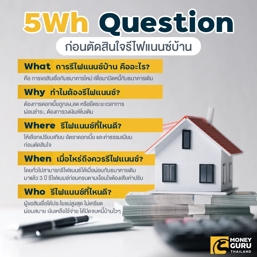 หนี้บ้าน เป็นหนี้ก้อนโตระยะยาวที่ต้องใช้ระยะเวลาผ่อนนาน 20 - 30 ปี คนเป็นหนี้บ้านที่อยากปิดจบภาระหนี้เร็วๆ อยากเป็นเจ้าของบ้านจริงๆ สักที ก็มักจะหาตัวช่วยที่จะทำให้ผ่อนบ้านหมดไวๆ ซึ่ง "การรีไฟแนนซ์บ้าน" ถือเป็นตัวช่วยอันดับหนึ่งที่คนเป็นหนี้บ้านมักเลือกใช้กันค่ะ และวันนี้…ก่อนที่จะตัดสินใจรีไฟแนนซ์บ้าน เราจะพามาดู 5W Question ต้องรู้! ว่ามีอะไรบ้าง โดยเฉพาะมือใหม่เรื่องการเป็นหนี้บ้าน ตามมาดูกันเลย…