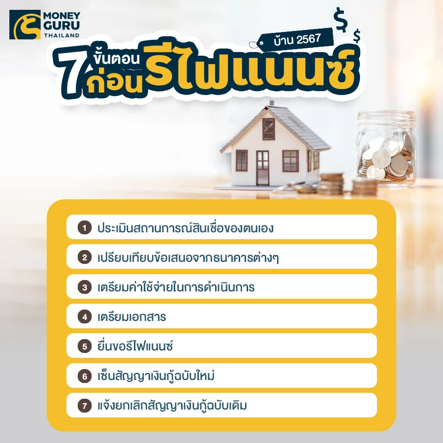 การรีไฟแนนซ์บ้าน เป็นวิธีการที่ช่วยให้สามารถลดดอกเบี้ย หรือเปลี่ยนเงื่อนไขของสินเชื่อบ้านเดิม ช่วยลดค่าใช้จ่ายรายเดือน และเพิ่มความคล่องตัวทางการเงิน เมื่อผ่อนบ้านมาแล้ว 3 ปี อยาก รีไฟแนนซ์บ้าน เพื่อลดดอกเบี้ยสักหน่อย ต้องเตรียมตัวอย่างไร วันนี้…เรามาแนะนำ 7 ขั้นตอนง่ายๆ สำหรับคนที่กำลังเตรียมตัวจะรีไฟแนนซ์บ้านนะคะ ทำได้แบบนี้ รีไฟแนนซ์บ้าน ผ่านแน่นอน