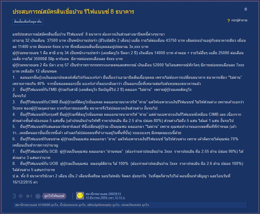 จากตัวอย่างกระทู้ข้างต้น จขกท. ใช้เวลา 2 เดือนกว่าจะสามารถรีไฟแนนซ์ พร้อมขอวงเงินเพิ่มได้ตามที่ต้องการ ซึ่งหากเป็นกรณีที่ต้องการรีไฟแนนซ์บ้านปกติ หากเราไม่แน่ใจว่าคุณสมบัติผู้กู้ของเราจะผ่านเกณฑ์การพิจารณาของธนาคารหรือไม่ การยื่นขอรีไฟแนนซ์หลายที่พร้อมๆ กัน ยังช่วยให้เราประหยัดเวลา และสามารถรีไฟแนนซ์ไปธนาคารที่มีข้อเสนอดีกว่าได้เร็วยิ่งขึ้น