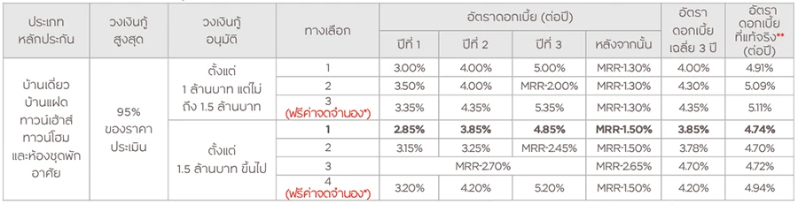 - เฉพาะลูกค้าที่ซื้อ MRTA/MLTA ตามเงื่อนไขที่กำหนดเท่านั้น*** จึงจะสามารถเลือกรับดอกเบี้ยทางเลือกที่ 3 (วงเงินกู้อนุมัติตั้งแต่ 1 ล้นบาท แต่ไม่ถึง 1.5 ล้านบาท) หรือทางเลือกที่ 4 (วงเงินกู้อนุมัติตั้งแต่ 1.5 ล้านบาทขึ้นไป) ได้