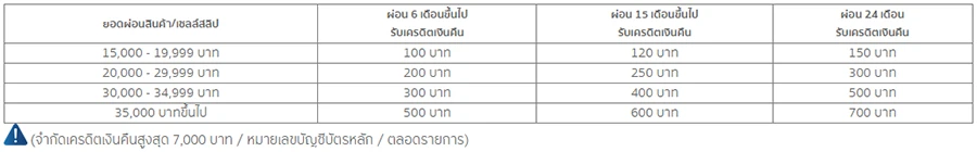 - *ยอดเครดิตเงินคืนจะคำนวณยอดแบ่งจ่ายตั้งแต่ 15,000 บาทขึ้นไป / เซลล์สลิป และผ่อนชำระนาน 6 เดือนขึ้นไป