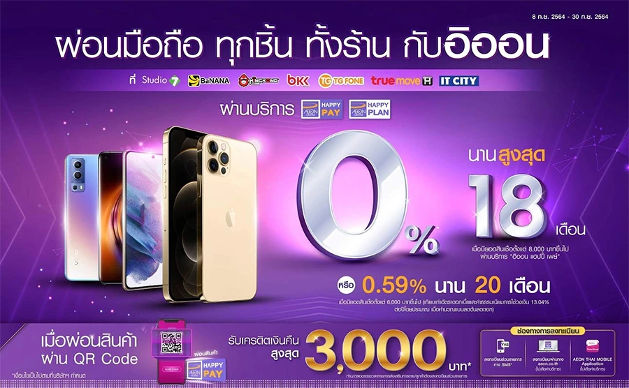 - เมื่อผ่อนชำระมือถือทุกรุ่น ยอดสินเชื่อตั้งแต่ 5,000 บาทขึ้นไป/เซลล์สลิป รับอัตราดอกเบี้ย 0% นาน 10 เดือน ผ่านบริการ อิออน แฮปปี้ แพลน (วงเงินบัตรเครดิต)