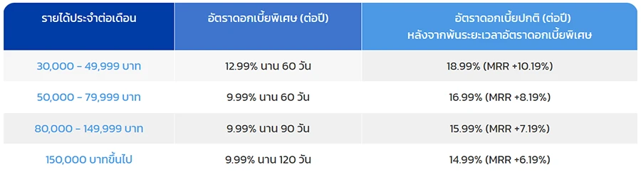 - อัตราดอกเบี้ยพิเศษต่อปี สำหรับจำนวนเงินที่มีการเบิกใช้ภายในระยะเวลาที่กำหนดตารางข้างต้น และนับจากวันที่ลงในหนังสือแจ้งผลการพิจารณาอนุมัติสินเชื่อหมุนเวียนส่วนบุคคล