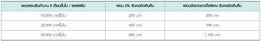 - ยอดเครดิตเงินคืนจะคำนวณจากยอดผ่อนชำระตั้งแต่ 10,000 บาทขึ้นไป/ เซลล์สลิป/ชิ้น และผ่อนชำระนาน 6 เดือนขึ้นไป เท่านั้น