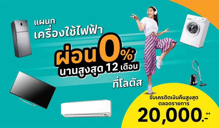 บัตรสินเชื่อโลตัส พรีเมียร์ ผ่อนเครื่องใช้ไฟฟ้า 0% นานสูงสุด 12 เดือน เฉพาะสินค้าที่ร่วมรายการ ที่แผนกเครื่องใช้ไฟฟ้า โลตัส สาขาที่ร่วมรายการ