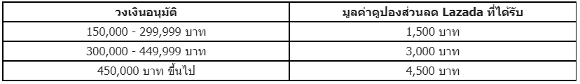 - รับรหัสส่วนลด Lazada มูลค่าสูงสุด 4,500 บาท เมื่อได้รับวงเงินอนุมัติตั้งแต่ 150,000 บาทขึ้นไป ดังนี้