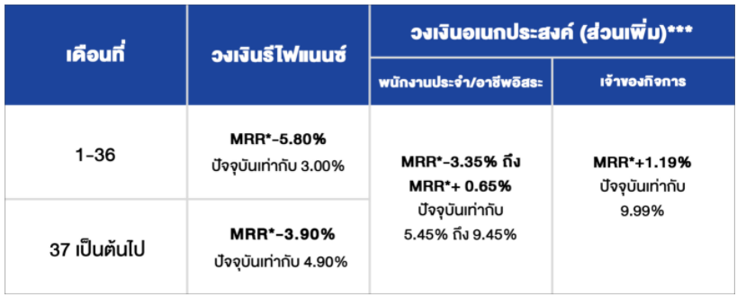- อัตราดอกเบี้ย MRR อ้างอิงตามประกาศธนาคารไทยเครดิต เพื่อรายย่อย (ปัจจุบัน MRR = 8.80% ต่อปี)