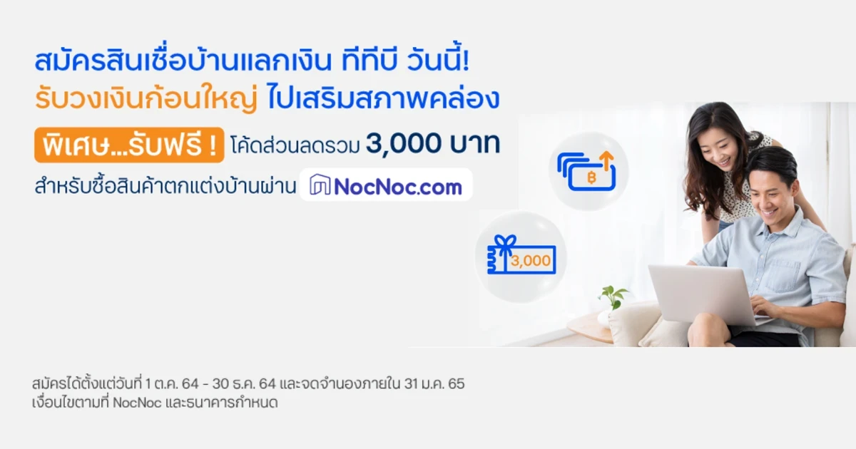 1) โค้ดส่วนลดนี้ เป็นสิทธิพิเศษสำหรับลูกค้าสินเชื่อบ้านแลกเงิน ทีทีบี เมื่อซื้อสินค้าผ่านเว็บไซต์ NocNoc.com ซึ่งสามารถใช้เป็นส่วนลดสินค้าได้ทุกประเภท ยกเว้นสินค้าประเภท ปูน, เหล็กก่อสร้าง, อิฐ, บ้านสำเร็จรูป, เสาเข็ม และ งานบริการ