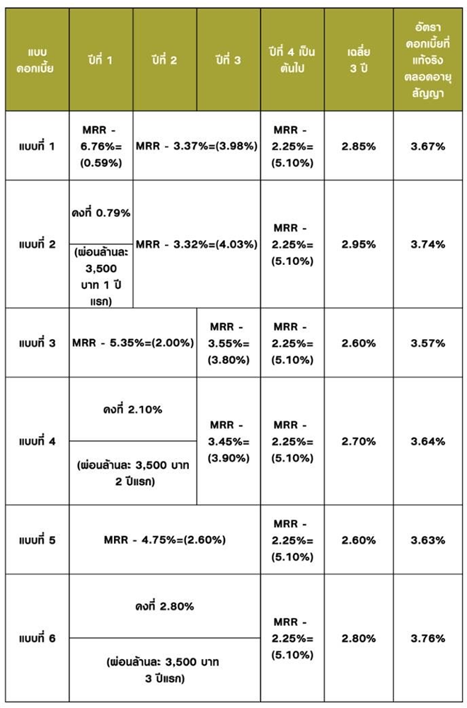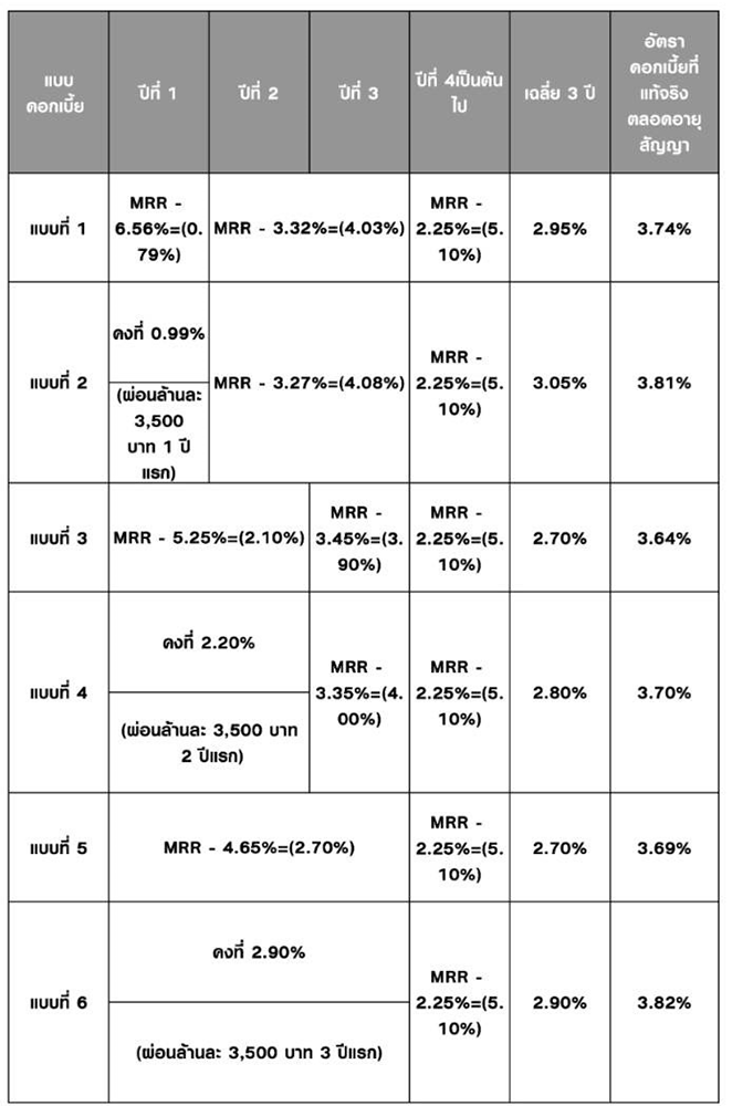 • อัตราดอกเบี้ยที่แท้จริงข้างต้นเป็นเพียงตัวอย่างอัตราดอกเบี้ยสำหรับสินเชื่อที่อยู่อาศัยวงเงิน 3 ล้านบาท อายุสัญญา 10 ปี MRR = 7.350% (ณ วันที่ 1 เม.ย. 64) ที่คำนวณตามเงื่อนไขที่ใช้ในโฆษณาฉบับนี้เท่านั้น ซึ่งอาจมีความแตกต่างตามเงื่อนไขการกู้ยืมของลูกค้าแต่ละราย
