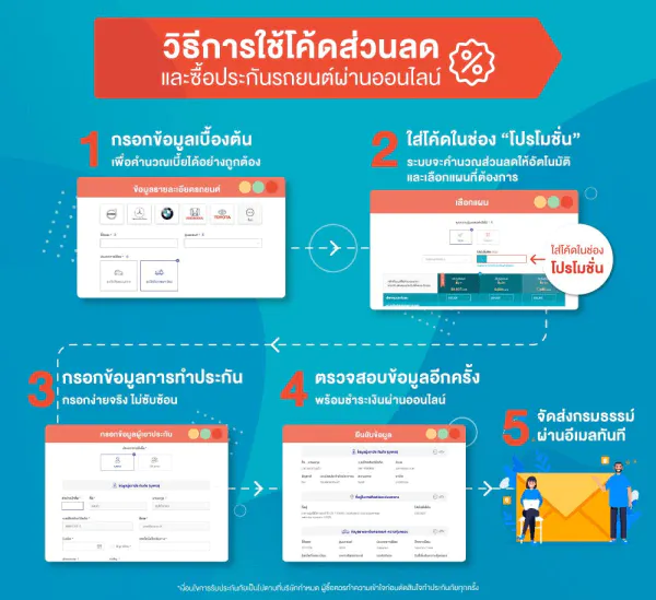 - โค้ดส่วนลดนี้ใช้ได้เฉพาะการซื้อกรมธรรม์ภาคสมัครใจผ่านช่องทางออนไลน์เท่านั้น ช่องทางอื่น ๆ ไม่สามารเข้าร่วมแคมเปญนี้ได้