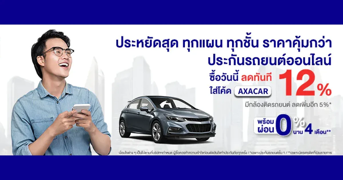 ซื้อประกันรถยนต์ผ่านออนไลน์ รับส่วนลด 12% ทันที เพียงใส่โค้ด AXACAR ประกันรถยนต์ออนไลน์จากแอกซ่า พร้อมมอบความคุ้มครองที่ดีที่สุด ประหยัดที่สุดและโปรโมชั่นสุดคุ้ม