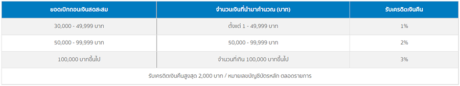 - รับเครดิตเงินคืน 1% สำหรับยอดเบิกถอนเงินสดสะสม ตั้งแต่ 30,000 - 49,999 บาท โดยคำนวณการให้เครดิตเงินคืนตั้งแต่บาทแรก
