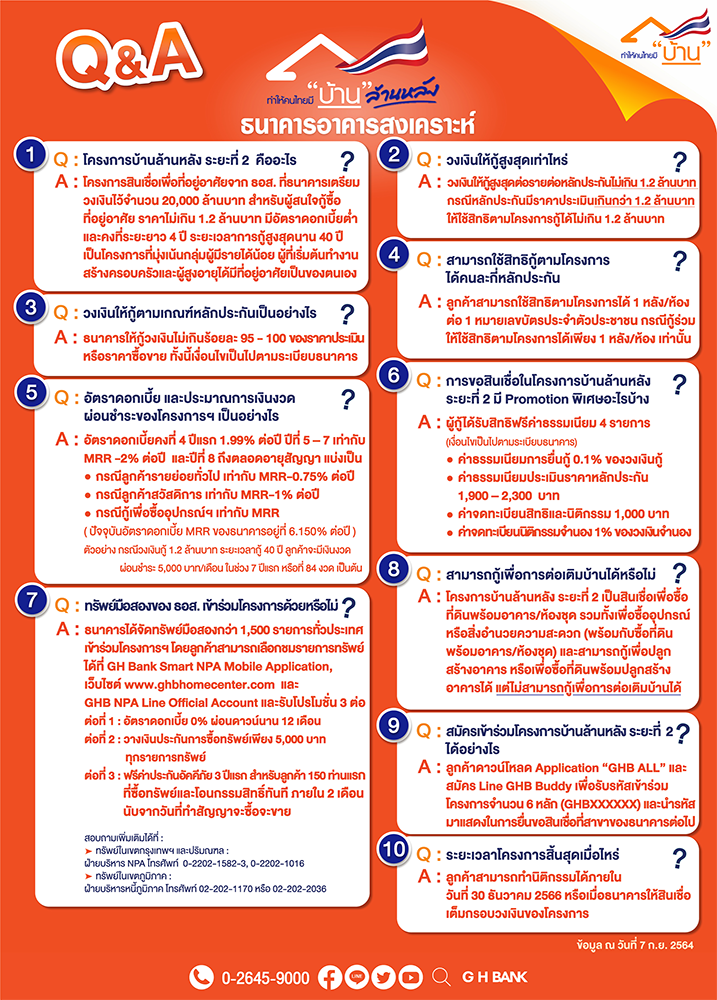 ด้วยความสำเร็จของโครงการระยะแรก และความมุ่งมั่นของรัฐบาลที่ต้องการดูแลผู้มีรายได้น้อยและปานกลางให้ได้มีที่อยู่อาศัย ที่มั่นคง ราคาไม่แพง ดอกเบี้ยสอดคล้องกับสถานการณ์ปัจจุบัน โดยเฉพาะกลุ่มที่ไม่สามารถเข้าถึงสินเชื่อในระบบสถาบันการเงิน ผู้ที่เริ่มต้นทำงานเพื่อสร้างครอบครัว และผู้สูงอายุ ทำให้ที่ประชุมคณะรัฐมนตรีเมื่อวันที่ 7 กันยายน 2564 ได้มีมติเห็นชอบตามที่กระทรวงการคลังเสนอให้ ธอส. สานต่อโครงการสินเชื่อเพื่อที่อยู่อาศัยแห่งรัฐ หรือ โครงการบ้านล้านหลัง ระยะที่ 2 โดยปรับกรอบวงเงินโครงการเพิ่มอีกจำนวน 20,000 ล้านบาท อัตราดอกเบี้ยคงที่ 4 ปีแรก 1.99% ต่อปี ให้กู้ซื้อที่อยู่อาศัยราคาซื้อ-ขายไม่เกิน 1,200,000 บาท ทั้งบ้านใหม่ บ้านมือสอง และทรัพย์ NPAของ ธอส. เงินงวดคงที่นานถึง 84 งวดแรก ฟรี!! ค่าธรรมเนียม 4 ประเภท ลงทะเบียนผ่าน Mobile Application : GHB ALL เพื่อรับรหัสเข้าร่วมโครงการได้ตั้งแต่วันศุกร์ที่ 10 กันยายน 2564 เวลา 9.00 น. เป็นต้นไป