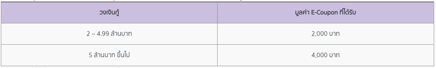 - รับฟรี e-Coupon Lotus’s มูลค่าเริ่มต้น 2,000 บาท (สูงสุด 4,000 บาท) เมื่อสมัครและได้รับอนุมัติสินเชื่อบ้านใหม่, บ้านมือสอง หรือรีไฟแนนซ์ วงเงินกู้ 2 ล้านบาทขึ้นไป กรณีใช้อัตราดอกเบี้ยแบบทำประกัน Credit Life 70%/70% กำหนดให้ทำทุนประกันไม่น้อยกว่า 70% ของวงเงินกู้ และระยะเวลาเอาประกัน 70% ของระยะเวลากู้ตามสัญญา โดยกำหนดให้ระยะเวลาเอาประกันขั้นต่ำ 10 ปี (กรณีระยะเวลากู้ตามสัญญาต่ำกว่า 10 ปี กำหนดให้ระยะเวลาเอาประกันเท่ากับระยะเวลากู้ตามสัญญา) และให้ลูกค้ากู้ Top up ประกันอัคคีภัยรวมในวงเงินกู้