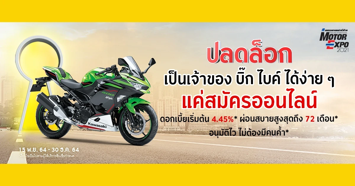 ปลดล็อค เป็นเจ้าของ บิ๊ก ไบค์ ได้ง่ายๆ แค่สมัครออนไลน์ ดอกเบี้ยเริ่มต้น 4.45%* ผ่อนสบายสูงสุดถึง 72 เดือน* อนุมัติไว ไม่ต้องมีคนค้ำ*