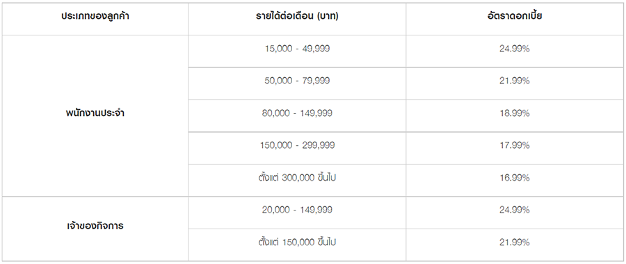 - พิเศษ ดอกเบี้ย 9.99% 2 เดือนแรก สำหรับพนักงานประจำ ผู้มีรายได้/เดือน ตั้งแต่ 50,000 บาทขึ้นไป
