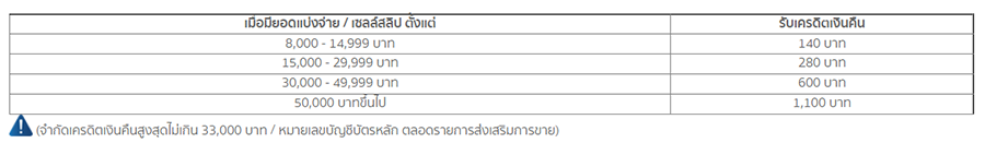 เครดิตเงินคืนจะคำนวณจากยอดผ่อนชำระ(หลังหักส่วนลด)ตั้งแต่ 8,000 บาทขึ้นไปต่อเซลส์สลิป และรับเครดิตเงินคืนสูงสุดไม่เกิน 33,000 บาท ต่อหมายเลขบัญชีบัตรหลัก ตลอดรายการ - ยอดใช้จ่ายไม่นับรวมรายการใช้จ่ายที่เกิดจากการใช้บัตรเครดิตโดยผิดวัตถุประสงค์ (เพื่อการค้าขาย) และผิดกฎหมาย