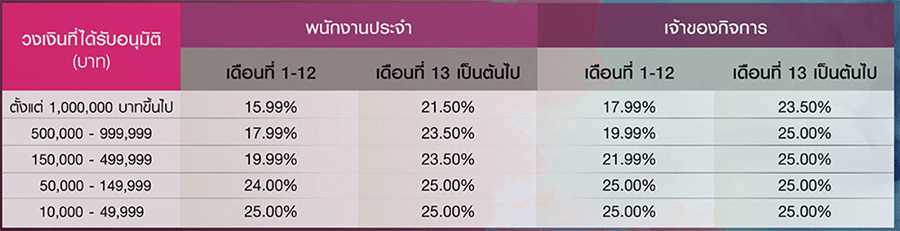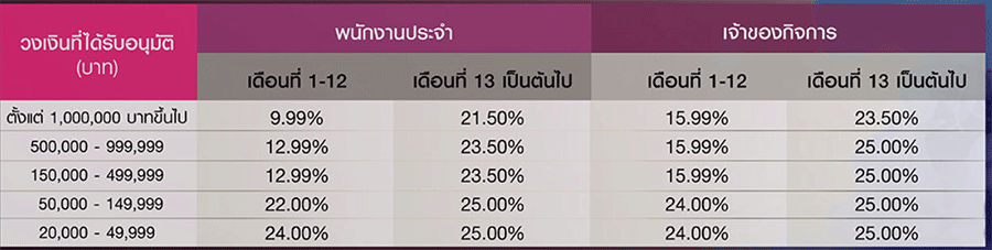 - กรณีลูกค้าผิดนัดชำระ ธนาคารจะคิดอัตราดอกเบี้ยผิดนัดชำระจากอัตราดอกเบี้ยปกติสูงสุดตามสัญญาบวกส่วนเพิ่ม 3% สูงสุดไม่เกิน 25% ต่อปี (แต่ต่อไปอาจเปลี่ยนแปลงได้ตามที่ธนาคารกำหนด) รวมทั้งค่าติดตามทวงถามหนี้ (ถ้ามี) ค่าธรรมเนียมและค่าใช้จ่ายอื่น ๆ ตามประกาศของธนาคาร ณ ขณะนั้น