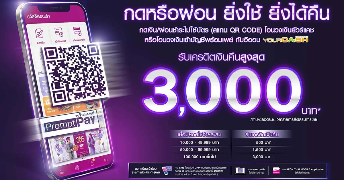 - การโอนวงเงินเข้าบัญชีพร้อมเพย์ หมายเหตุ: วงเงินเบิกถอนเงินสด/โอนวงเงินเป็นไปตามวงเงินที่ได้รับอนุมัติจากบริษัทฯ ยอดที่ผู้ถือบัตรสามารถเบิกถอนเงินสดได้ ขึ้นอยู่กับวงเงินคงเหลือในบัญชี โดยวงเงินสำหรับเบิกถอนเงินสด/โอนวงเงินอาจมีการเปลี่ยนแปลงขึ้นอยู่กับประวัติการชำระเงิน) - บริษัทฯ สงวนสิทธิ์การให้เครดิตเงืนคืน เฉพาะลูกค้าที่ทำรายการ เบิกถอนเงินสด ผ่อนชำระสินค้า โดยไม่ใช้บัตร(ผ่านการสแกน QR CODE) โอนวงเงินยัวร์แคช และ/หรือ โอนวงเงินเข้าบัญชีพร้อมเพย์ เท่านั้น ลูกค้าที่ทำรายการโดยใช้บัตร ไม่สามารถรวมยอดกับการใช้บริการเบิกถอนเงินสด และ/หรือผ่อนชำระสินค้า (AEON Happy Pay) ผ่านรายการส่งเสริมการขายนี้ได้
