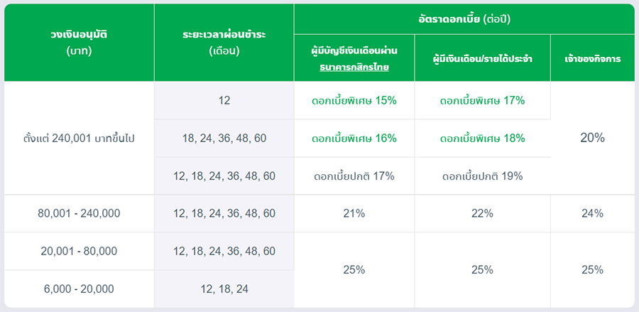 - กรณีได้รับการอนุมัติสินเชื่อเงินก้อนวงเงิน 6,000 - 20,000 บาท เลือกระยะเวลาผ่อนชำระได้ 12, 18 หรือ 24 เดือนเท่านั้น