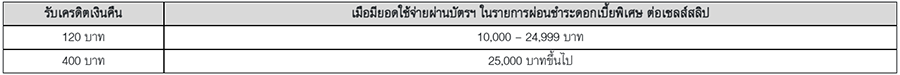 *ขอสงวนสิทธิ์ยกเว้นการมอบคะแนนทุกประเภท สำหรับยอดใช้จ่ายผ่านบัตรฯ ที่นำมาคำนวณเพื่อมอบเครดิตเงินคืนตามรายการนี้