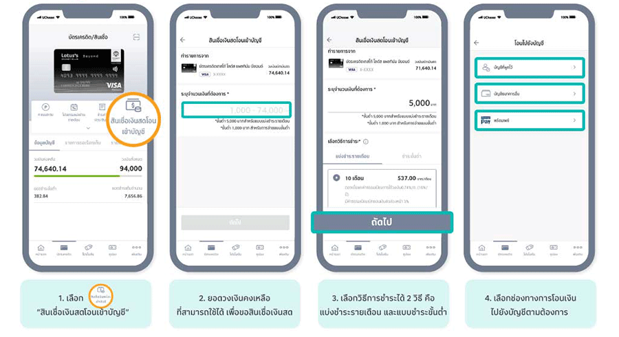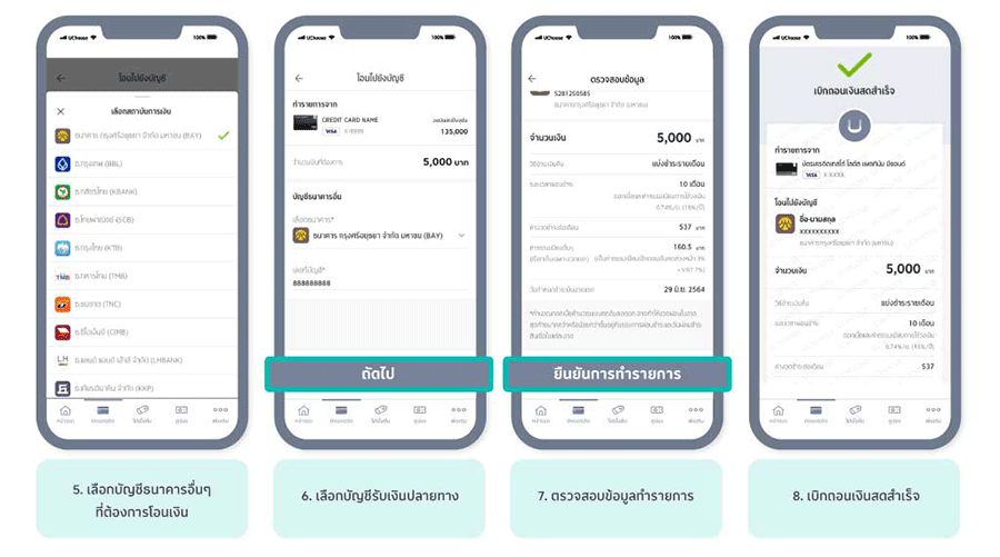 - สงวนสิทธิ์เฉพาะสมาชิกบัตรฯ ที่เบิกถอนเงินสดผ่านแอป UCHOOSE โดยใช้ฟีเจอร์สินเชื่อเงินสดโอนเข้าบัญชี (UCash) ครั้งแรกครั้งเดียวเท่านั้น