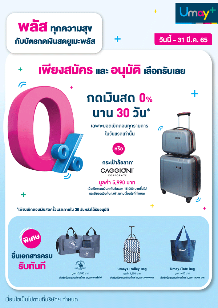 เงื่อนไขเป็นไปตามที่บริษัทฯ กำหนด สอบถามรายละเอียดเพิ่มเติม ณ จุดบริการยูเมะพลัส หรือติดต่อลูกค้าสัมพันธ์ โทร. 0 2695 0000