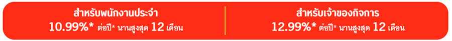 - อัตราดอกเบี้ยพิเศษ 12.99% นาน 6 เดือนแรก สำหรับผู้สมัครสินเชื่อที่เป็นเจ้าของกิจการมีอายุงานตั้งแต่ 5 ปีขึ้นไป และได้รับอนุมัติวงเงินสินเชื่อตั้งแต่ 300,000 บาท - 999,999 บาท
