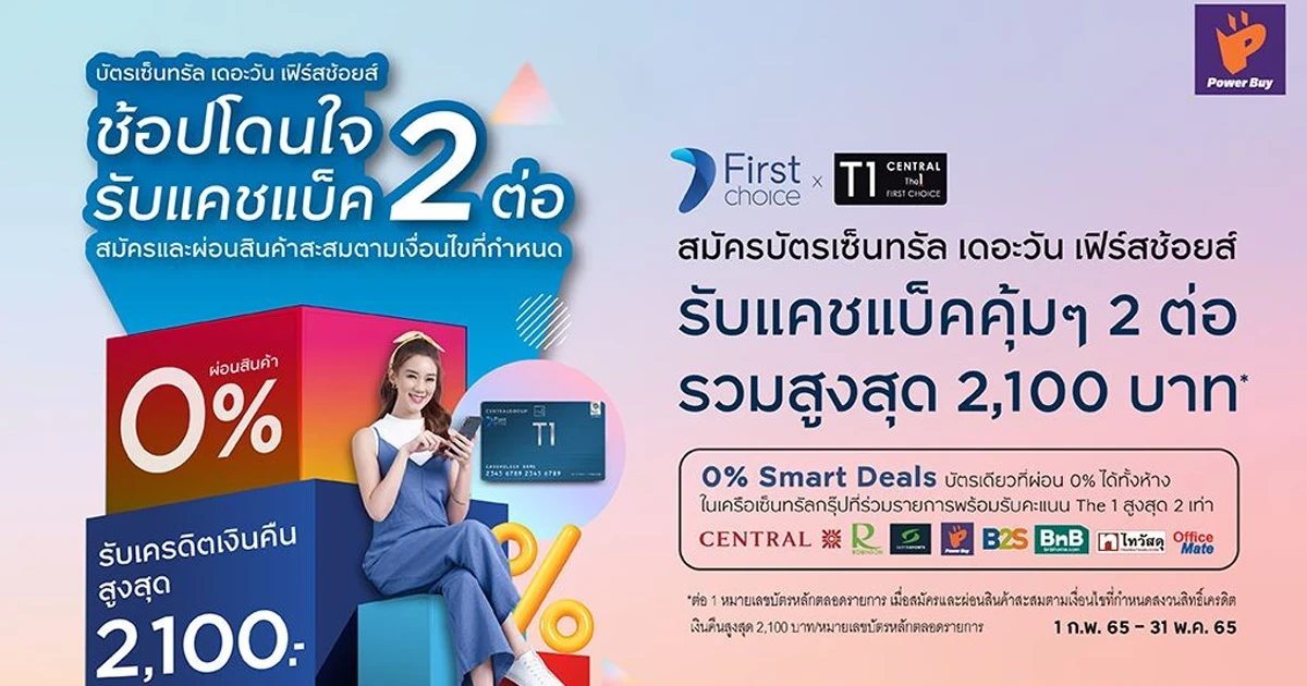 สมัครง่าย อนุมัติไว 0% สั่งได้ ทุกชิ้น ทั้งห้าง พร้อมรับคะแนน The1 เพิ่มสูงสุด 2 เท่า เมื่อสมัครบัตรเซ็นทรัล เดอะวัน เฟิร์สช้อยส์ พิเศษ!! สมัครบัตรวันนี้รับเครดิตเงินคืนสูงสุด 2,100 บาท* เมื่อมียอดผ่อนสินค้า ณ ร้านค้าในเครือ เซ็นทรัล กรุ๊ป ที่ร่วมรายการ ภายใน 30 วันนับจากวันอนุมัติ (ไม่รวมการกดเงินสด)