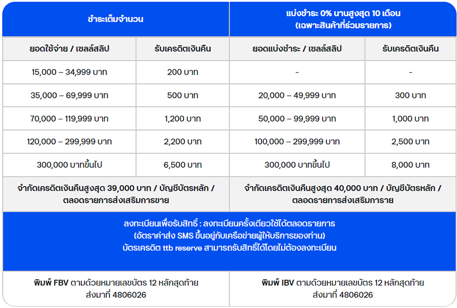 - เงื่อนไขการให้เครดิตเงินคืนเพิเศษ 1 สำหรับชำระเต็มจำนวน จำกัดเครดิตเงินคืนสูงสุด 39,000 บาท / บัญชีบัตรหลัก (คำนวณรวมยอดใช้จ่ายทั้งบัตรหลักและบัตรเสริม) / ตลอดรายการส่งเสริมการขาย และสำหรับรายการแบ่งชำระ 0% นานสูงสุด 10 เดือน จำกัดรับเครดิตเงินคืนสูงสุด 40,000 บาท / บัญชีบัตรหลัก (คำนวณรวมยอดใช้จ่ายทั้งบัตรหลักและบัตรเสริม) / ตลอดรายการส่งเสริมการขาย