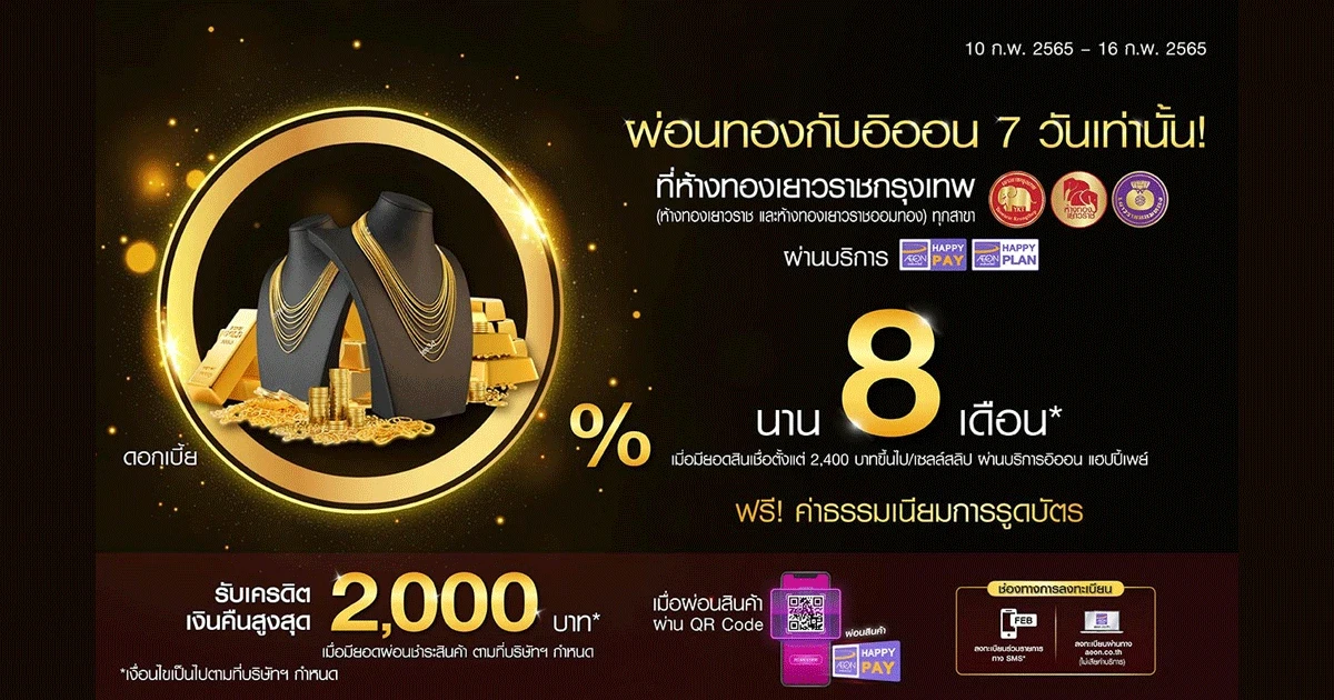 ผ่อนชำระทองคำ รับอัตราดอกเบี้ย 0% นาน 8 เดือน เมื่อมียอดสินเชื่อตั้งแต่ 2,400 บาทขึ้นไป/เซลล์สลิป สำหรับบริการ "อิออน แฮปปี้ เพย์" หรือเมื่อมียอดสินเชื่อตั้งแต่ 4,000 บาทขึ้นไป/เซลล์สลิป สำหรับบริการ "อิออน แฮปปี้ แพลน"