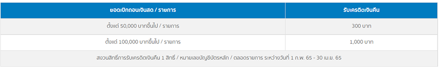 - รายการเบิกถอนเงินสด ตั้งแต่ 50,000 บาทขึ้นไปต่อรายการ รับเครดิตเงินคืน 300 บาท