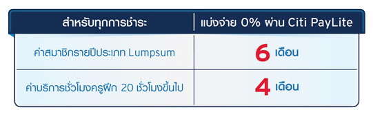 - แบ่งจ่ายดอกเบี้ย 0% 4 เดือน และ 6 เดือน สำหรับทุกการชำระค่าสมาชิกหรือค่าบริการตามที่กำหนด โดย Fitness First และ/หรือ Celebrity Fitness