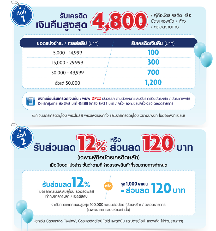 1) สำหรับบัตรเครดิตยูโอบี / บัตรเครดิต TMRW แบ่งชำระ 0% 6 เดือน ทุกชิ้น ทั้งห้าง - ต่อที่ 1: เมื่อมียอดแบ่งชำระสินค้าตั้งแต่ 5,000 บาท ขึ้นไป ต่อเซลส์สลิป รายละเอียดการรับเครดิตเงินคืน ตามยอดแบ่งชำระต่อเซลส์สลิป ที่ระบุไว้ในตารางด้านหน้าสื่อโฆษณา จำกัดการรับเครดิตเงินคืนสูงสุด 4,800 บาท ต่อผู้ถือบัตรเครดิต หรือบัตรแคชพลัส ต่อห้างสรรพสินค้า ตลอดรายการส่งเสริมการขาย