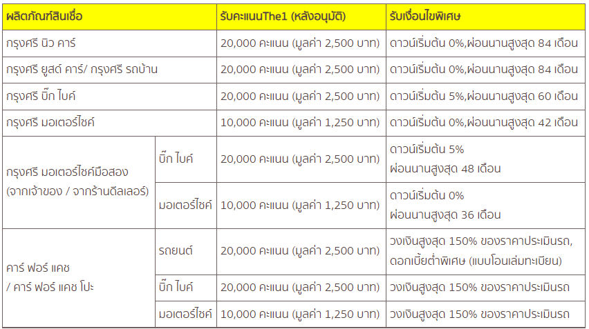 - ลูกค้าเก่าปิดบัญชีแล้วไม่เกิน 5 ปี ทุกผลิตภัณฑ์สินเชื่อ กรุงศรี ออโต้ (ยกเว้น ผลิตภัณฑ์ประกันภัย) - ลูกค้าเก่าที่ปิดบัญชีมากกว่า 5 ปี จะได้รับคะแนน The 1 แต่ไม่ได้รับเงื่อนไขพิเศษ