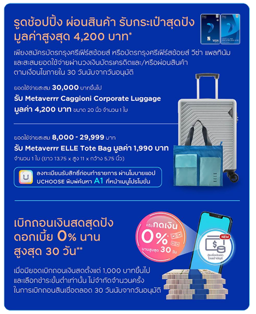 *เงื่อนไขเพิ่มเติม บัตรกรุงศรีเฟิร์สช้อยส์ วีซ่า แพลทินัม และบัตรกรุงศรีเฟิร์สช้อยส์ สำหรับลูกค้าใหม่ทำรายการรูดช้อปปิ้ง และรายการผ่อนสินค้า